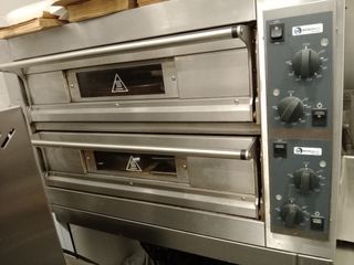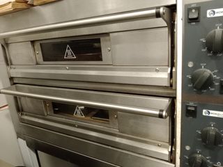 Horno de acero inoxidable Zanoli de doble capacidad. Ideal para uso comercial o industrial. - Dos hornos independientes de 4 bandejas cada uno. - Controles de temperatura precisos. - Diseño robusto y duradero. - Incluye soporte.