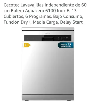 Lavavajillas independiente Cecotec de 60 cm. - Modelo Bolero Aguazero 6100 Inox. - Capacidad para 13 cubiertos. - 6 programas de lavado. - Bajo consumo energético (Etiqueta E). - Función Dry+, Media Carga y Delay Start.