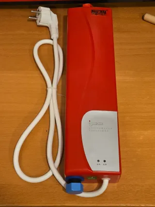 Calentador de agua eléctrico instantáneo con un diseño moderno. - Color principal: rojo. - Cable de alimentación blanco. - Conexión de agua 1/2"
