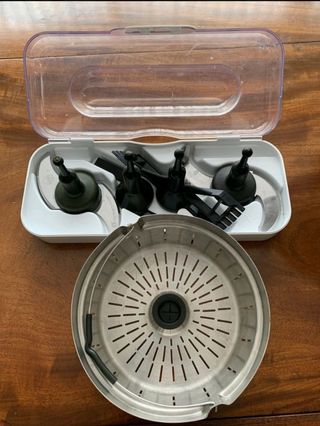 se vende robot de cocina moulinex i-companion con accesorios (cuchilla picadora, amasador, mezclador, triturador) y cesta de vapor. Buen estado, pequeño desperfecto en el tapón que no influye en funcionamiento del robot. también se incluye vaporera nueva, sin usar ni una sola vez.
