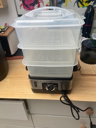Vaporera SilverCrest con tres niveles de cocción. Se encuentra en perfecto estado, habiendo sido utilizada solo dos veces. - Tres cestas transparentes apilables. - una cesta para arroz - Tapa con asa. - Base con control de tiempo y luz indicadora.
