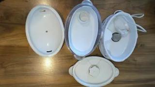 Prácticamente nueva, usada solo una vez para probarla. No era lo que buscaba. Incluye: Cuenco para arroz y 3 recipientes para cocinar al vapor Material: Acero inoxidable, libre de BPA Funciones: Temporizador y dos entradas laterales de agua Potencia: 800 W