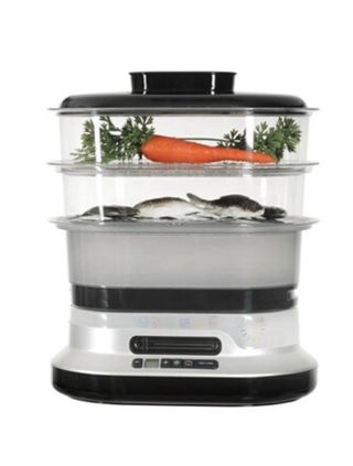 Vaporera eléctrica SEB para cocinar de forma saludable. - Diseño moderno en color blanco y negro. - Tres niveles de cocción apilables. - Panel de control digital con temporizador.
