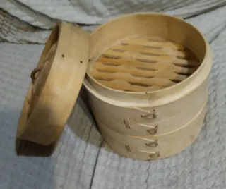 Vaporera de bambú en perfecto estado, lista para usar. - Dos pisos de bambú. - Ideal para cocinar al vapor. - Diseño clásico y elegante.