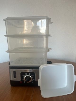 Aparato vaporera para cocinar al vapor en varios compartimentos, lo que te permite cocinar varios platos a la vez (arroz, verduras, pescado,...). Como nueva.