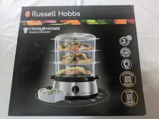 Vaporera eléctrica de la marca Russell Hobbs, ideal para cocinar al vapor de forma saludable. - Base de acero inoxidable. - Dos niveles de vapor. - Tapa transparente con asas.