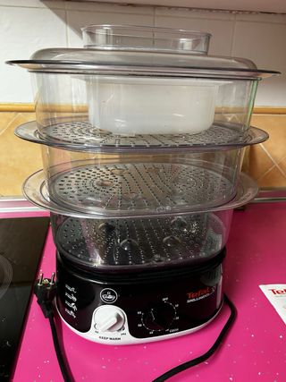Vaporera eléctrica Tefal para cocinar al vapor de forma saludable y sencilla. Ideal para preparar comidas nutritivas. - Diseño compacto y fácil de usar. - Múltiples niveles para cocinar diferentes alimentos a la vez. - Indicador de nivel de agua. - Función 'Keep Warm' para mantener la comida caliente. Funciona perfectamente. No hago envíos.