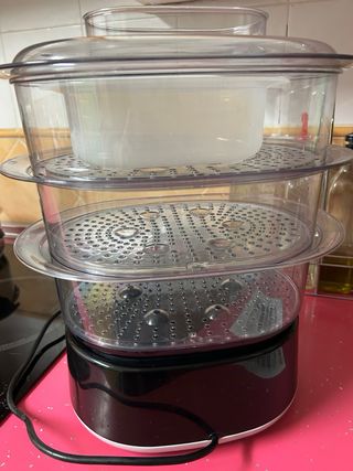 Muy poco usado, no más de tres usos. La vendo porque tengo poco almacenamiento en la cocina y no sé dónde guardarlo. - Vaporera eléctrica para cocinar al vapor con cuenco para preparar arroz. - 1L, acero inoxidable, 800W de potencia - 3 recipientes, capacidad 9L; soportes para la cocción de huevos, todo apto para lavavajillas - Temporizador de 60 minutos, con indicador lumínico y sonoro al finalizar la cocción - Almacenaje compacto, función de desconexión automática y sistema de protección contra el sobrecalentamiento.