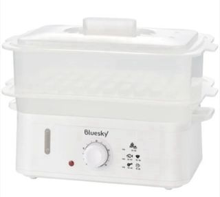 Vaporera eléctrica marca Bluesky con dos niveles para cocinar al vapor. - Diseño compacto y funcional. - Tapa transparente con asa. - Indicador de nivel de agua. - Temporizador con dial.