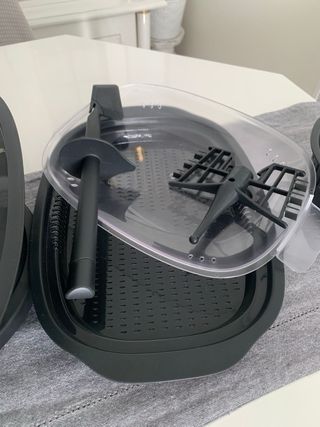 Conjunto de accesorios para robot de cocina, incluyendo una vaporera y su tapa. - Vaporera de plástico negro con perforaciones. - Tapa transparente de plástico.