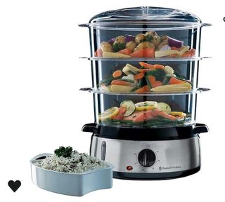 Vaporera Russell Hobbs de 3 niveles, completamente nueva y sin usar. - Diseño de 3 niveles para cocinar varios alimentos a la vez. - Tapa transparente para supervisar la cocción. - Base de acero inoxidable.