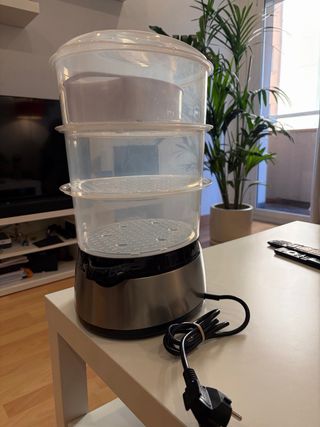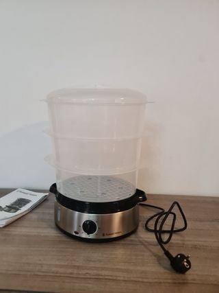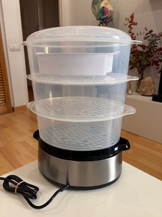 Vendo vaporera de la marca Silvercrest. Está en buen estado y tiene tres bandejas de vapor. Es perfecta para cocinar verduras, pescado y otros alimentos al vapor. - Marca: Silvercrest - Tres bandejas de vapor - Capacidad: 3 pisos - Color: Acero inoxidable y negro