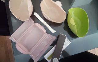 Juego de cocina Lekue. Hay 3 moldes/recipientes, 1 estuche vapor, un multirallador... Y una pequeña espátula. Muy poco uso (alguns cosa, ninguno).