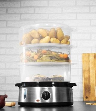 Vaporera Cecotec Mambo, ideal para preparar comidas saludables al vapor. Diseñada para complementar tu robot de cocina. En tienda: 29€ - Incluye accesorios para cocinar al vapor. - Pala para remover ingredientes.