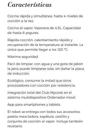 Robot de cocina inteligente con, literalmente 2 usos, prácticamente nuevo. Con wifi, pantalla táctil digital de 7 pulgadas y software interactivo para descargar más de 150 recetas guiadas y actualizadas periodicamente. Incluye jarra waterproof de 4.5L, balanza integrada de 5kg, vaporera de 2 niveles con tapa, lo que permitirá una cocción simultánea de hasta 4 platos a la vez. Con todos sus accesorios. Con 30 funciones que permiten cocinar, rallar, cocer, sofreír, cocinar al vapor, picar (incluso hielo), amasar, trocear, hervir, cocinar a baja temperatura y al baño maría, triturar, licuar, cocción lenta, elaborar yogur purés...