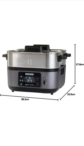 Vaporera Morphy Richards con dos niveles para cocinar. - Diseño moderno en color gris y acero inoxidable. - Panel de control digital. - Dimensiones: 38.2cm (ancho) x 33.5cm (profundidad) x 27.8cm (alto).