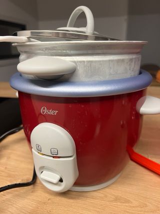Arrocera Oster en color rojo con vaporera incluida. Perfecta para preparar hasta 6 tazas de arroz cocido. - Capacidad para 6 tazas de arroz cocido. - Función automática de mantenimiento de calor. - Incluye bandeja vaporera para cocción saludable.