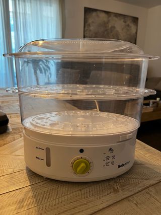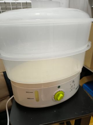 Cocedora a vapor + accesorio especial cerrado para cocer arroz y sopa . Potencia máxima 900 W.Tiene 8.5 l de capacidad. Temporizador digital. Infusor de hierbas y especias. La vendo por compra de robot de cocina, pero funciona perfectamente.