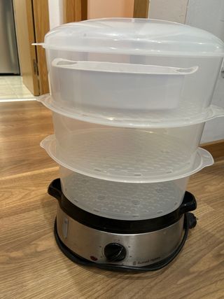 Vaporera eléctrica Russell Hobbs en excelente estado, casi nueva. Ideal para cocinar de forma saludable. - Tres niveles de cocción,se puede usar para verduras, huevos y arroz. - Temporizador de 1 hora. - Tapa transparente. - Base de acero inoxidable. - Incluye una cubeta para cocinar arroz. - Diseño moderno y funcional. - Fácil de usar y limpiar.