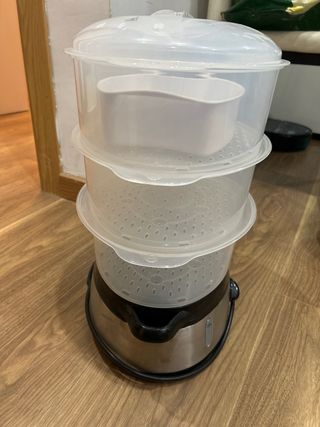 Vaporera multirecipientes para poder cocinar varias cosas a la vez. Usada muy poca veces por falta de costumbre. Tiene la caja original y las instrucciones.