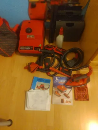 Equipo completo de limpieza a vapor Lady Vap 1500 con accesorios en buenas condiciones. - Unidad principal de vapor. La carcasa tiene una raja que se pegó y desde entonces está así, pero no influye para la máquina (ver ultima foto). - Plancha de vapor en buen estado. - Manguera de vapor. - 2 tubos de extensión. - Cepillo para suelos, alfombras y sofás. - Accesorios de limpieza. - Botella de llenado. - Caja para guardar los accesorios. También útil para personas que arreglan vaporetas y quieren vender los accesorios sueltos y utilizar la máquina para piezas.