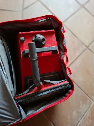 Equipo de limpieza a vapor Vaporeta Lady Vap, diseñado para tareas de limpieza y planchado. - Unidad principal de color rojo. - Incluye manguera y accesorios. - Bolsa de transporte gris con detalles rojos.