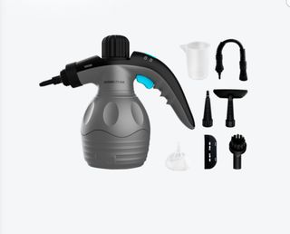 Pequeña vaporeta, ideal para limpieza del hogar. Incluye varios accesorios para diferentes usos. - Manguera con mango ergonómico. - Cepillo rectangular. - Guantes protectores. - Accesorios pequeños para detalles.