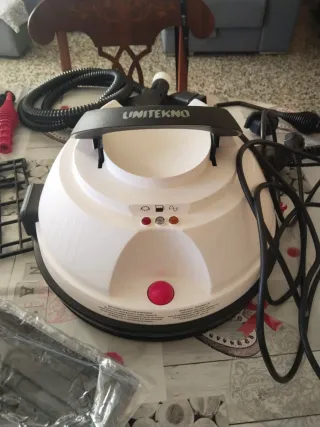 Vaporeta Unitekno modelo 703. - Color blanco y negro. - Asa de transporte. - Conexión para accesorios, y todos los accesorios. Prácticamente está nueva, se la compró mi abuela por qué usaba mucho una con menor potencia, al comprarse esta y ver qué tenían demasiada longitud tanto los cables como los tubos etcétera prefirió seguir usando la vieja por comodidad, la uso dos veces contadas.