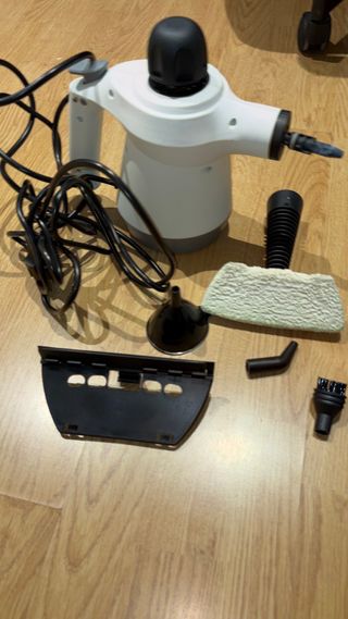 Limpiador a vapor portátil con varios accesorios. - Unidad principal blanca. - Cable de alimentación negro. - Embudo negro. - Cepillo de limpieza con mango negro. - Accesorio de limpieza con tela. - Adaptador curvo negro. - Accesorio de cepillo redondo negro. - Base de soporte negra.