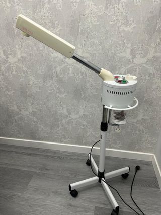 Máquina de vapor facial con soporte y ruedas. Ideal para tratamientos de belleza. - Altura ajustable. - Brazo orientable. - Depósito de agua. - Base con ruedas para fácil movilidad.