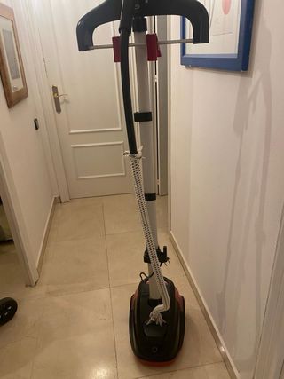 Vaporizador de ropa Rowenta en buen estado. - Base con ruedas para fácil movilidad. - Manguera de vapor flexible. - Percha integrada para colgar la ropa.
