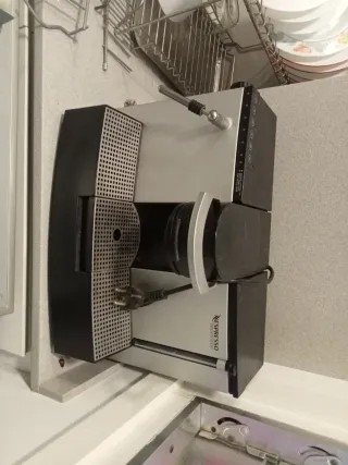 Cafetera Nespresso de diseño elegante y funcional. - Acabado plateado y negro. - Panel de control con botones. - Vaporizador para leche.