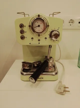 Cafetera de expreso CREATE en color verde menta, con un diseño retro. Cuenta con un manómetro para controlar la temperatura y un vaporizador para leche. Tiene 2 años, pero poco uso.