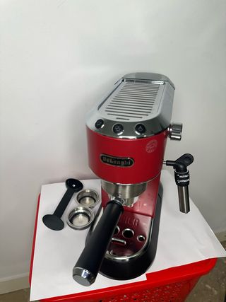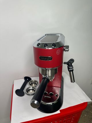 Cafetera espresso DeLonghi Dedica en color rojo. Incluye accesorios para preparar café. - Diseño compacto y elegante. - Vaporizador para leche.