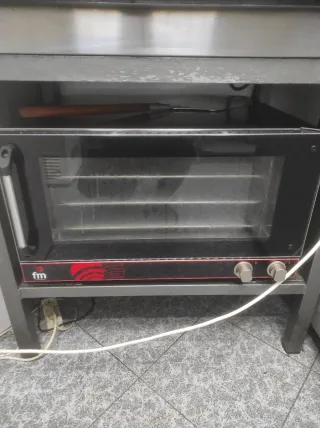 Horno de calor ventilado de la marca FM. - Puerta de cristal. - Dos mandos giratorios para control. - Asa lateral para apertura.