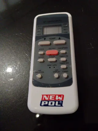 Mando a distancia para aire acondicionado de la marca New Pol. Diseñado para un fácil manejo. - Botones para modo, temperatura y ventilador. - Funciones de temporizador y SLEEP. - Indicador LED y TURBO.