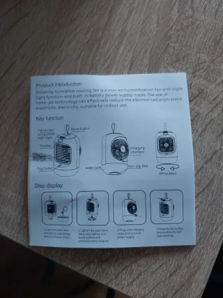 Ventilador de mesa con un diseño moderno y compacto. - Incluye cable de carga USB. - Botella de agua transparente para humidificar.
