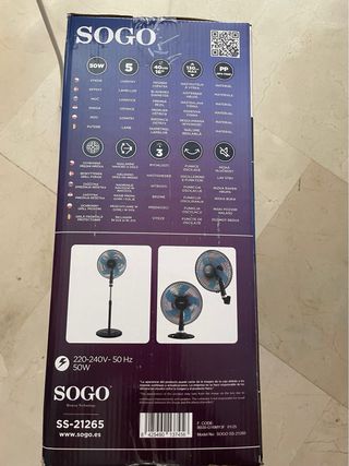 Vendo ventilador de pie Sogo SS-21265. Es un ventilador 3 en 1 (de pie, de mesa y de pared) con una potencia de 50W. Tiene 3 velocidades y función de oscilación. Altura ajustable hasta 130 cm. El ventilador está en buen estado. - 3 velocidades - Oscilación - Altura ajustable - 3 en 1 (pie, mesa, pared)