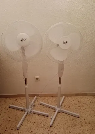 Se venden dos ventiladores de pie blancos, ideales para mantener tu espacio fresco. - Altura regulable. - Base estable en forma de cruz. - Rejilla de protección. - Marca: Elta y M-VIP.