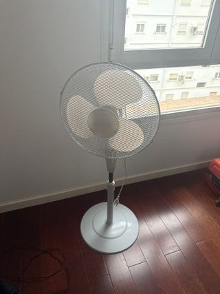 Ventilador de pie con base estable y rejilla protectora. Los dos - Color blanco. - Diseño clásico. - Altura ajustable.