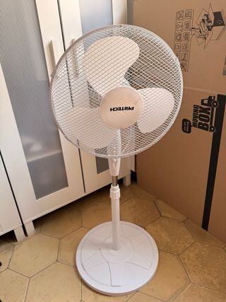 Ventilador de pie en color blanco. Ideal para mantener la estancia fresca. - Altura regulable. - Base estable. - Rejilla de protección.