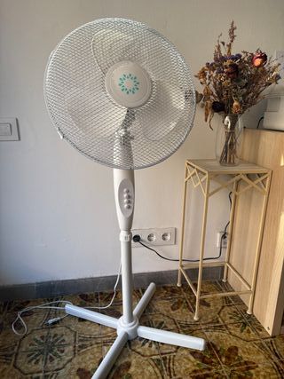 Ventilador de pie en buen estado y funcionamiento. - Color blanco. - Base estable. - Altura ajustable.