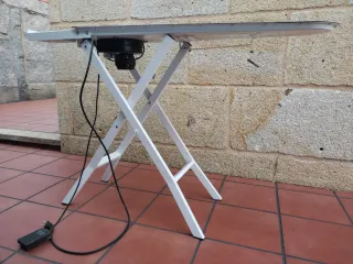 Mesa de planchar de uso industrial. Cuenta con una estructura plegable y un ventilador incorporado. - Superficie de planchado perforada. - Patas plegables para fácil almacenamiento. - Incluye cable de alimentación y pedal.
