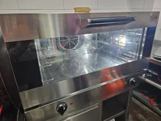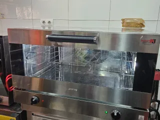 Horno profesional de convección de uso industrial. Ideal para negocios de hostelería. Horno profesional Dobra de convección, ideal para panadería, pastelería, restaurante o catering. • Cocción uniforme mediante ventiladores traseros • Control manual de temperatura (hasta aprox. 300 °C) • Construcción robusta en acero inoxidable • Incluye estructura/soporte metálico • Uso profesional (no doméstico) Estado: usado Motivo de venta: no uso / cierre Funcionamiento: correcto Medidas aproximadas • Ancho: 85–90 cm • Fondo: 75–80 cm • Alto horno: 55–60 cm • Alto total con soporte: ~150 cm Recogida en domicilio