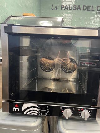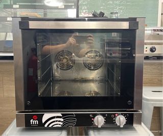 Horno de convección industrial de la marca FM. Medidas 76cms ancho alto 51cms. fondo 71cms. Utiliza ventiladores internos para distribuir el calor de manera uniforme, permitiendo una cocción más rápida y consistente. Cuenta con controles manuales de temperatura y temporizador programable. Tiene capacidad para 4 bandejas. Fabricado en acero inoxidable con puerta de doble cristal para aislamiento y seguridad. Los modelos de FM son de fabricación nacional (España) - Diseño robusto y profesional. - Puerta de cristal para visualización. - Bandejas interiores para cocción.