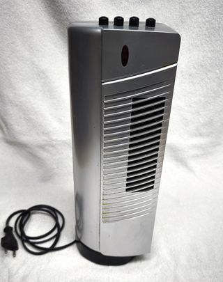 Ventilador de torre plateado con diseño moderno. - Rejilla frontal con lamas horizontales. - Varias velocidades. - Giro automático seleccionable. En buen estado. Únicamente entrega en mano