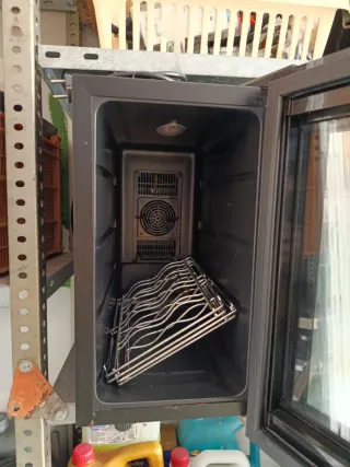 Enciende ventilador pero no muestra luces ni enfría. Ideal para manitas o recambios. Estética en buen estado, puerta de cristal intacta. Capacidad para 8 botellas. Se vende tal cual.