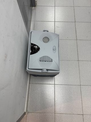 Importante! NO ENFRÍA. Capacidad 29 Litros Nevera eléctrica para 12 V DC en el coche y toma de 230 V AC. Esta nevera portátil con sistema Peltier actualmente no enfría y probablemente necesite reparación. Estado: No enfría. El ventilador funciona, pero el elemento de enfriamiento no. ¿Interesado/a en arreglarlo? - Tapa superior extraíble.