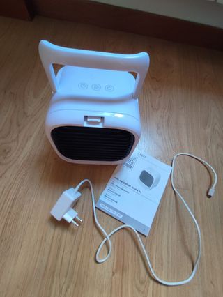 Calefactor eléctrico portátil con diseño moderno. - Asa integrada para fácil transporte. - Rejilla protectora frontal. Tenía un calorcito suelto, posiblemente en la mudanza. Arreglado. Hasta el martes no estoy. Gracias.