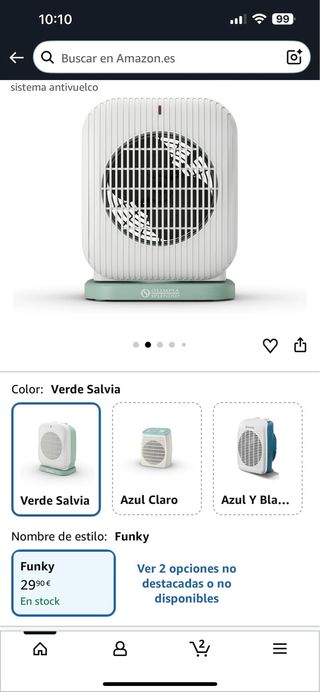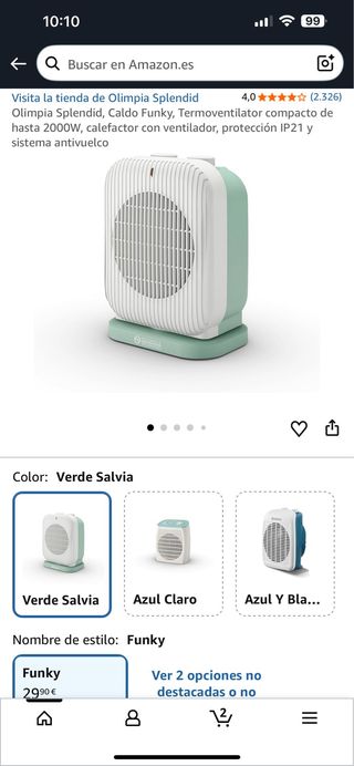 Calefactor compacto de la marca Olimpia Splendid, modelo Funky. - Color: Verde Salvia. - Potencia: hasta 2000W. - Incluye ventilador. - Protección IP21. - Sistema antivuelco.